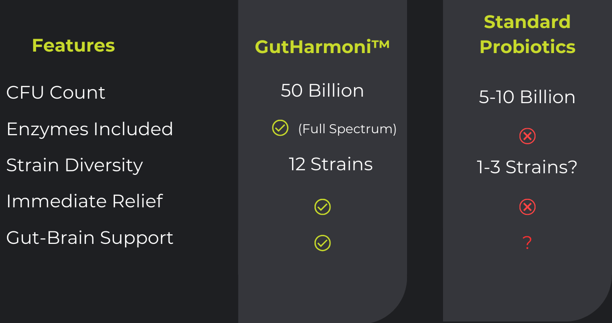 The Solution: GutHarmoni replenishes your enzyme levels for a "clean burn" of your food and re-colonizes your gut with Bifidobacterium to lower stress signals.