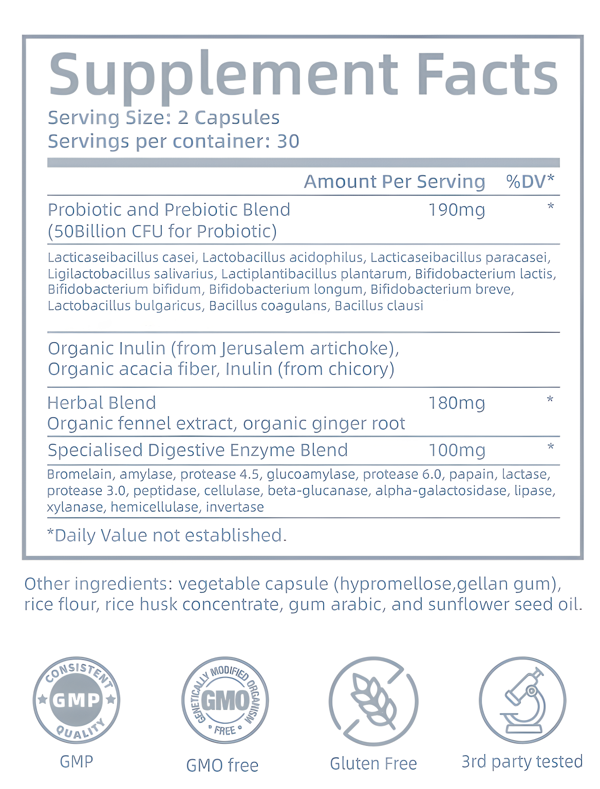 - Digestive Enzyme Matrix: Amylase, Protease, Lipase, Lactase, Bromelain.