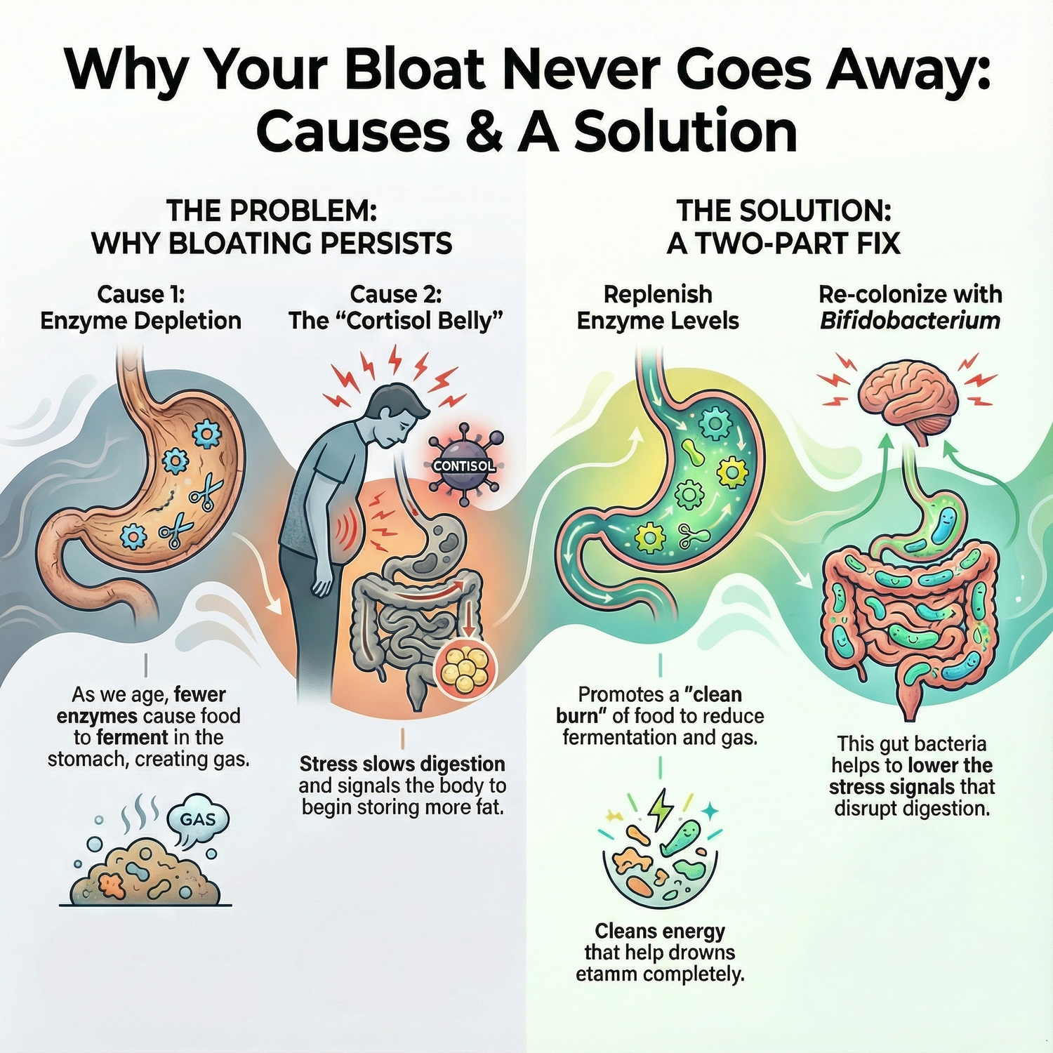 The Problem: Age and stress deplete your natural enzyme levels, making complex meals harder to digest.