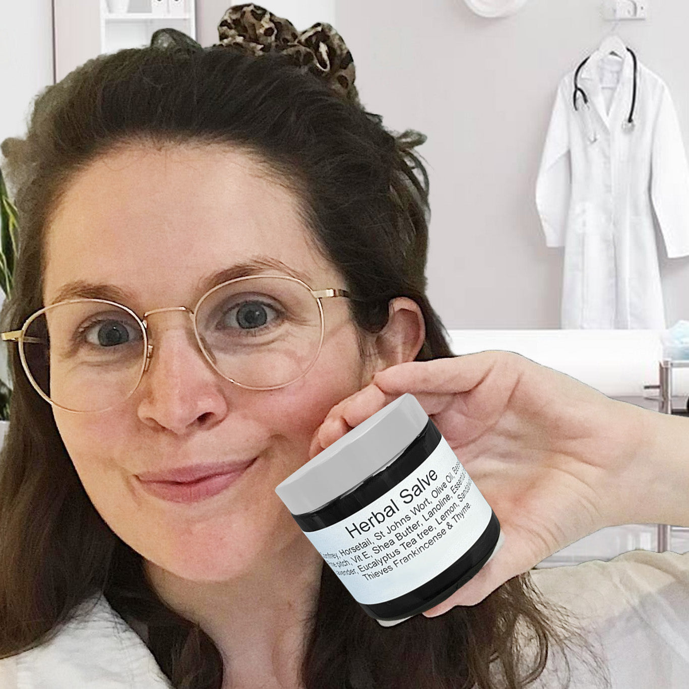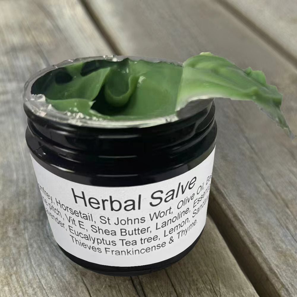 This herbal salve contains Comfrey, Horsetail, St. John's Wort, organic extra virgin olive oil, beeswax, pine pitch, vitamin E, shea butter, and lanolin. Essential oils include Lavender, Eucalyptus, Tea tree, Lemon, Sandalwood, Thieves, Frankincense, and Thyme.